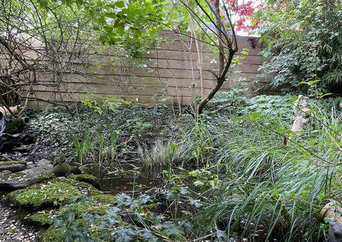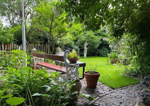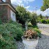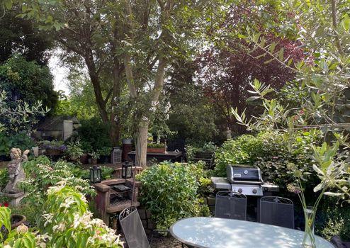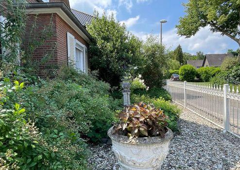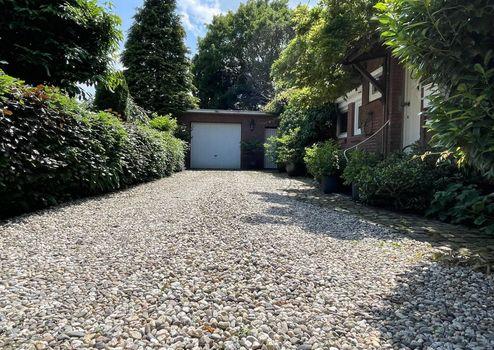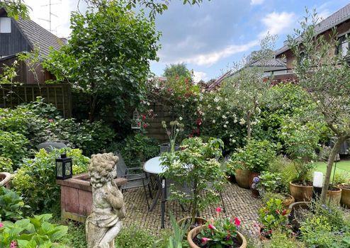 Die überdachte Terrasse, die direkt an das Wohnhaus angrenzt, bietet einen geschützten Platz im Freien, um das ganze Jahr über die Natur zu genießen. Der große Garten ist liebevoll angelegt mit einer Vielzahl von Sträuchern, Hecken, Bäumen und Zäunen, die Privatsphäre und Ruhe gewährleisten. Zusätzlich gibt es eine private Terrasse an der Seite des Hauses, die vom Wohnzimmer aus zugänglich ist und perfekt für entspannte Stunden im Freien geeignet ist.
