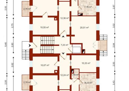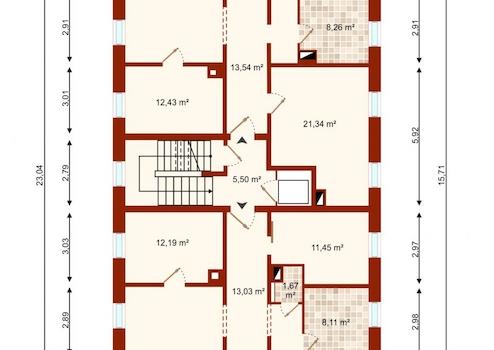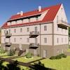 - Obere Dachwohnungen mit langem Balkon an der Giebelseite