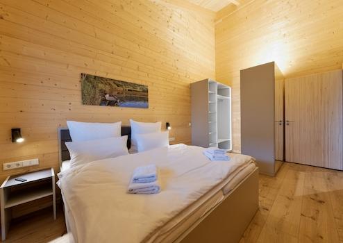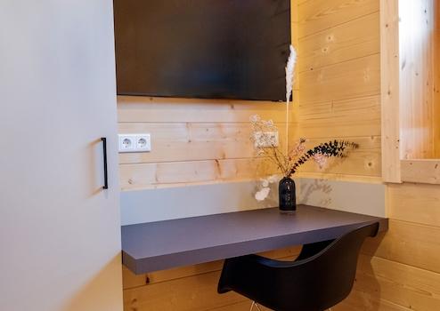 Mit einem Schlafzimmer, einem Büro bzw. Kinderzimmer, dem offenen Wohn- und Essbereich sowie zwei Stellplätzen ist das Chalet perfekt für Paare oder kleine Familien geeignet.