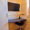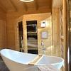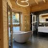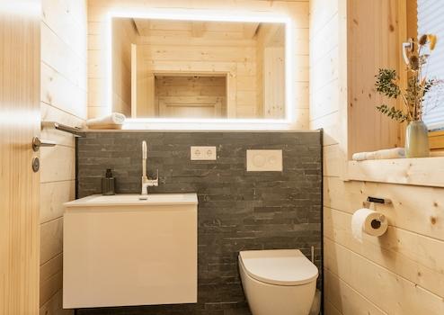 Ihr neues Badezimmer lädt zum Entspannen ein - es verfügt über eine Regendusche sowie eine freistehende Badewanne, eine Sauna und eine Nische für Fitnessgeräte. Ergänzend hierzu befindet sich ein Gäste-WC am Eingangsbereich des Chalets.