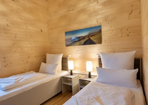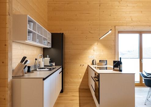 Mit einem Schlafzimmer, einem Büro bzw. Kinderzimmer, dem offenen Wohn- und Essbereich sowie zwei Stellplätzen ist das Chalet perfekt für Paare oder kleine Familien geeignet.
