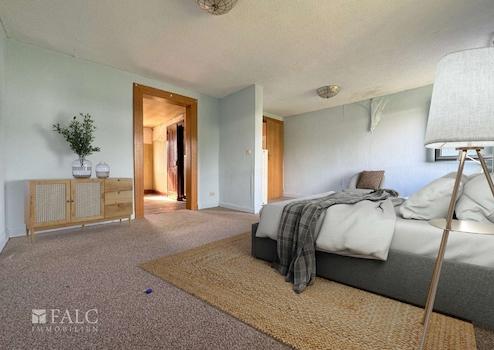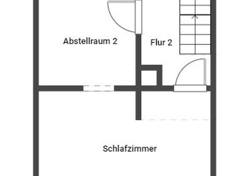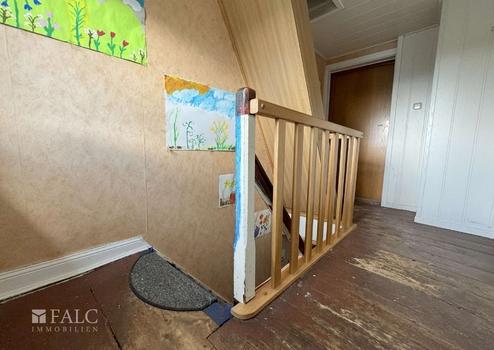 Eine Treppe im Eingangsflur führt zum ersten Obergeschoss, wo ein weiterer Flur zu finden ist. Dieser Flur bietet Zugang zu einer Treppe, die zum Dachboden führt, sowie zu zwei zusätzlichen Schlafzimmern. Dieses ist in einem baufälligen Zustand und steht zum Abriss bereit.