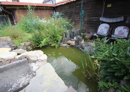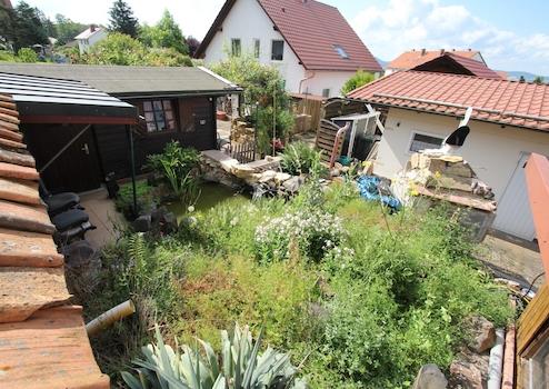 Im Garten wurde ein sehenswerter Gartenteich integriert und die Terrasse ermöglicht ein geselliges Beisammensein.
