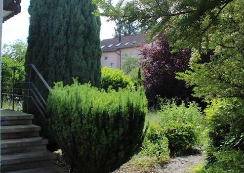 Der Gartenbereich mit hoher begrünter Hecke und gut gewachsenem Baumbestand rahmt das Haus in eine grüne Idylle ein. Viel Platz rund um das Haus zum Spielen für die Kinder oder romantische Grillabende mit Freunden und der Familie. Das Haus steht in einer ruhigen Gegend mit anschließenden Weinbergen in grüner Umgebung.(30 er Zone).