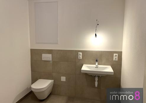 Im Badezimmer sind Anschlüsse für die Waschmaschine installiert. Genügend Stauraum ist in der Abstellkammer vorhanden.