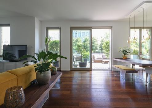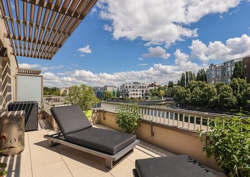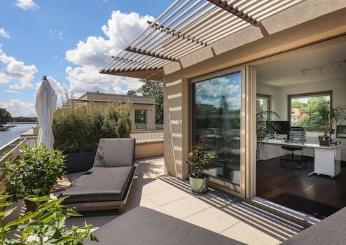 Die großzügige Wasserterrasse im Erdgeschoß sowie die Panorama-Terrasse im Dachgeschoß laden mit ihrer entspannten Atmosphäre zum Relaxen ein – alleine, zu zweit oder mit Familie und Freunden.
