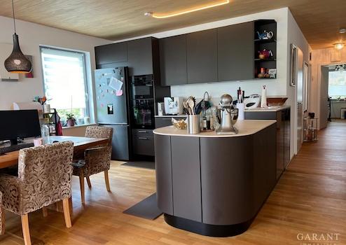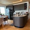 Die offen gestaltete, hochwertige Küche ist mit modernen Geräten ausgestattet.
