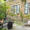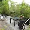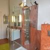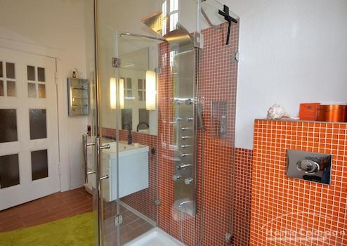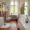 Geschmackvolles Tageslichtbad , Dusche mit Blick in den idyllischen Garten mit großem Esstisch zur Nutzung, Stellplatz direkt am Haus möglich, bei Bedarf kann ein weiterer Stellplatz angemietet werden.