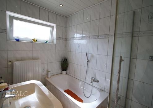 Das Haus besitzt eine gute Austattungsqualität. Die meisten Räume sind mit großen Bodenfliesen belegt, das Schlafzimmer ist mit Laminat in Holzoptik ausgestattet. Das Haupthaus besitzt ein großes Badezimmer mit Wanne und Dusche sowie ein Gäste-WC. In der Einliegerwohnung, die aber auch dem Haupthaus wieder zugeordnet werden kann, gibt es ebenfalls ein Badezimmer mit Wanne. Alle Bäder sind raumhoch gefliest.