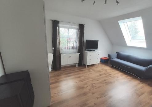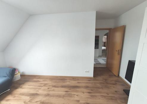 Die Dachgeschosswohnung besteht aus 4 Zimmern, einer Küche, einem Abstellraum, der Diele, einem Zwischenflur zu den Schlafräumen und einem Bad mit Badewanne und Dusche. Alle Räume sind von der großzügigen Diele aus erreichbar. Der Wohn- /Essbereich bietet Zugang zu einem großen, überdachten Balkon (Süd – West Ausrichtung), der durch eine Markise beschattet werden kann. Im Wohn- /Essbereich ist ebenfalls ein Kaminanschluss nutzbar. Als Bodenbeläge sind in der Dachgeschosswohnung Fliesenböden (Diele, Flur, Küche, Bad) und Laminatböden (Wohn- /Essbereich, Elternschlafzimmer, Kind 1 und 2) verlegt. Die Abstellkammer wurde mit PVC- Boden versehen.