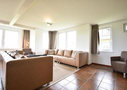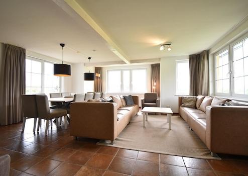 Das geräumige Wohnzimmer bietet Platz für bis zu 12 Personen, ideal für Familien- oder Freundestreffen. Die offene Küche ist voll ausgestattet und bietet einen nahtlosen Übergang zum Wohnbereich. Große Fenster bieten einen großartigen Blick auf die Umgebung, während der geflieste Boden zu einem modernen und pflegeleichten Look beiträgt.