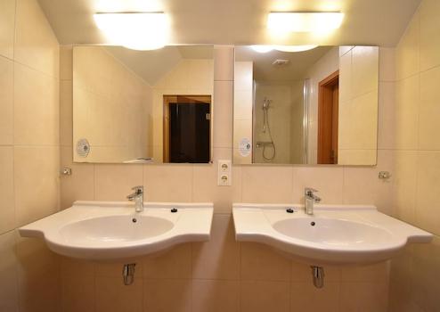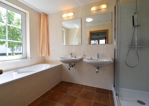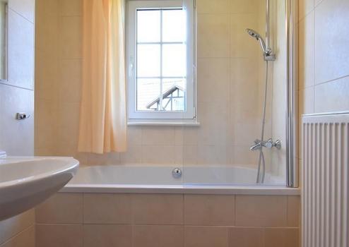 Badezimmer 3 verfügt über eine geräumige Badewanne mit einer neuen Badewannenabtrennung und einem modernen Waschbecken, ideal zum Entspannen und Pflegen.