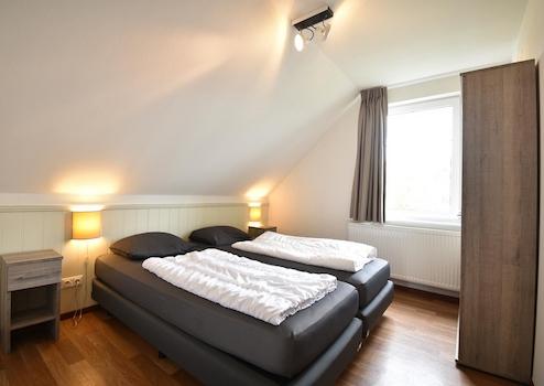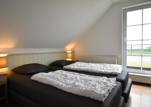 Das Schlafzimmer im Obergeschoss hat zwei bequeme Boxspringbetten und einen geräumigen Kleiderschrank.
