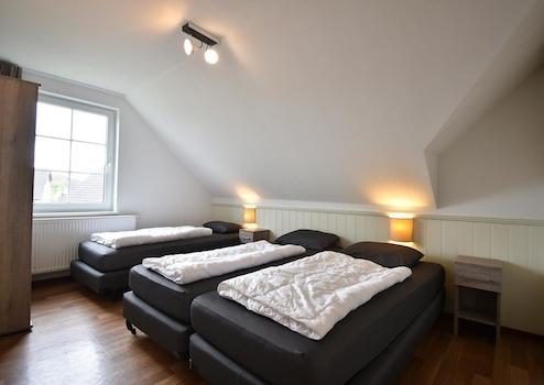 Das Schlafzimmer ist mit drei bequemen Boxspringbetten ausgestattet, ideal für eine erholsame Nachtruhe.