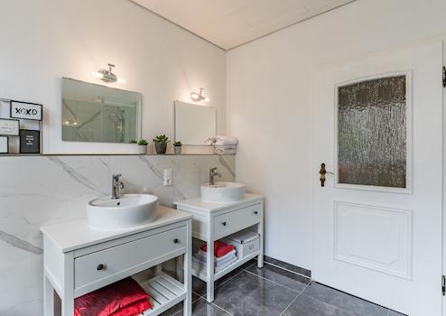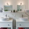 Luxuriöses, modernisiertes Badezimmer (3,23 x 2,95 m) mit Dusche, Waschtisch mit 2 Waschbecken und Toilette.