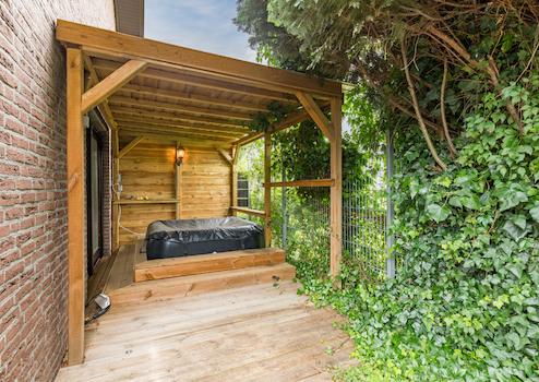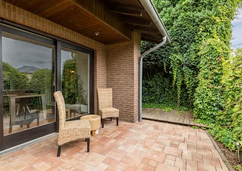 Seitengarten mit Terrassenüberdachung/Lounge-Bereich.