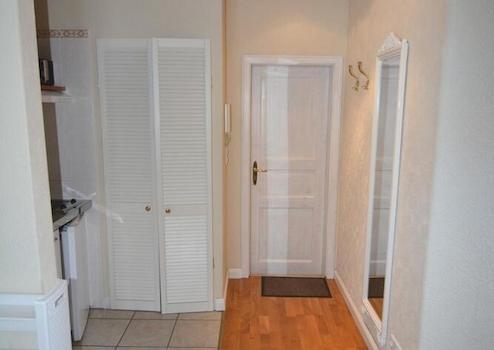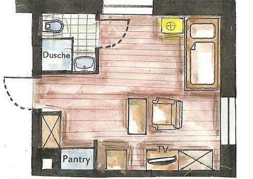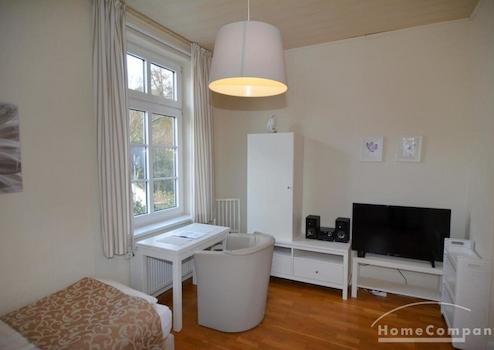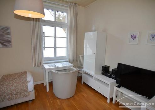 Die ca. 19m² große 1-Zimmerwohnung wurde 2014 komplett neu ausgebaut. Sie hat 1 Fenster nach Osten und 1 Fenster nach Norden, mit Blick auf die Geibelstraße. Ein bequemes Boxspringbett (90 x 200) sorgt für einen erholsamen Schlaf. Die Pantry verfügt über Spüle, 2-Kochplatten und einen Kühlschrank mit Gefrierfach. Im Wohnbereich steht ein Esstisch mit 1 Sessel. Ein SAT-TV mit Flachbildschirm in HD-Qualität steht zur Verfügung. Die Wohnung hat W-LAN-Empfang.