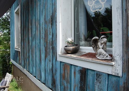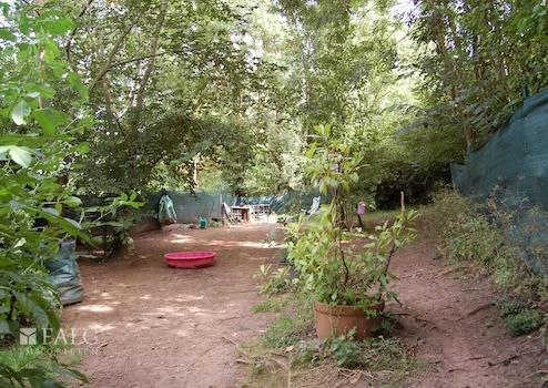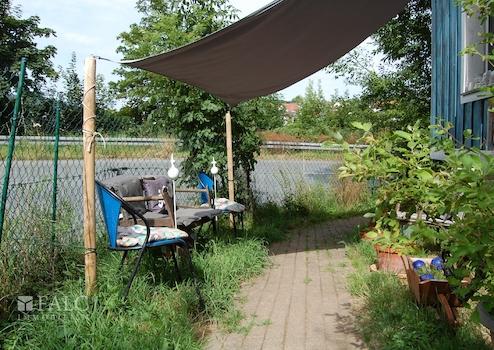 Vor dem Gebäude stehen drei Stellplätze zur Verfügung. Der Garten ist eingezäunt und über eine Holztreppe rechts vom Gartentor zugänglich. Der Zugang zum Keller erfolgt über eine grüne Holztür, die man von den Parkplätzen aus gut erreichen kann.