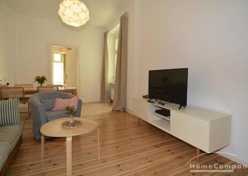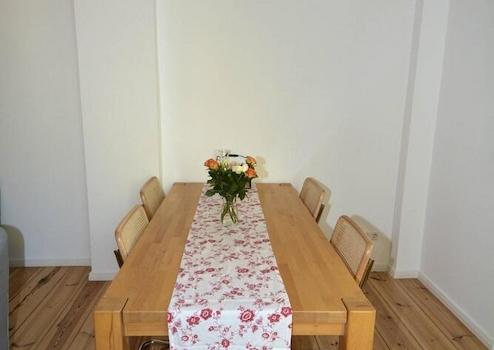 Die Wohnung befindet sich in der 1. Etage des Gartenhauses. Sie ist komplett möbliert und die Küche ist komplett mit Küchenutensilien ausgestattet. Im Wohn- und Schlafzimmer befindet sich Dielenboden. Das Wannenbad ist gefliest. Die Küche hat eine Spül- und eine Waschmaschine.