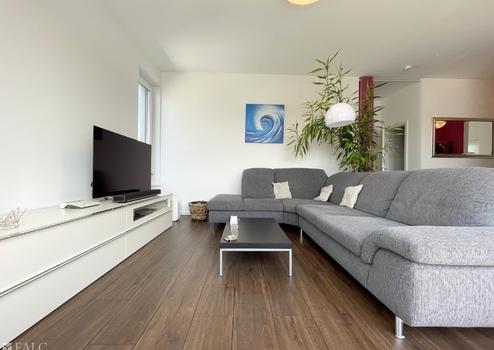 Die 2017 erbaute Wohnung überzeugt durch ihren offenen Grundriss, der eine helle und freundliche Wohnatmosphäre schafft. Große Fenster lassen viel Tageslicht herein und geben den Blick auf die umliegende Wohnumgebung frei, wodurch ein einzigartiges Wohngefühl entsteht. Der Wohnbereich, der Essbereich und die moderne Küche gehen nahtlos ineinander über und bieten so einen perfekten Raum für gesellige Abende und Familienleben.