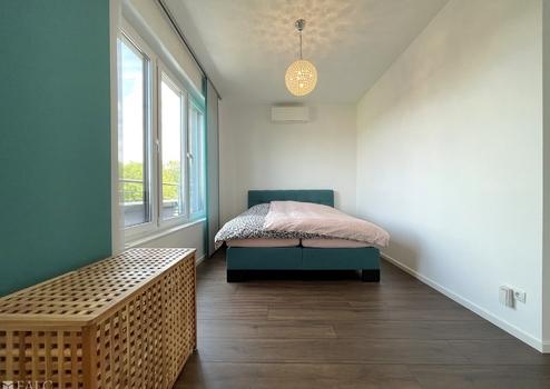 Der Rest der Wohnung ist mit edlem braunem Parkett ausgelegt, das für ein warmes und einladendes Wohngefühl sorgt. Große, dreifach verglaste Fenster in PVC-Rahmen lassen viel Tageslicht herein und bieten eine hervorragende Energieeffizienz. Diese Fenster sind zusätzlich mit elektrischen Rollläden ausgestattet, die Ihnen zusätzlichen Komfort bieten. Im Wohnzimmer und in beiden Schlafzimmern sorgt eine Klimaanlage für angenehme Temperaturen, selbst an heißen Sommertagen. Eine Fußbodenheizung sorgt in allen Räumen für wohlige Wärme und ein behagliches Wohngefühl.