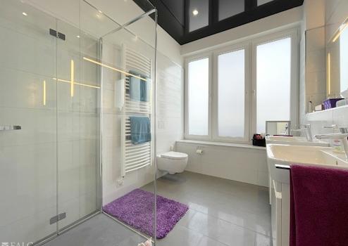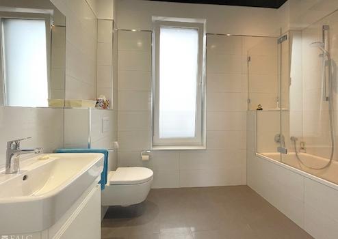 Die Wohnung verfügt über zwei moderne Bäder, die jeweils mit einem Fenster ausgestattet sind und somit Tageslicht und Frischluft bieten. Ein Bad ist mit einer Duschwanne ausgestattet, ideal für entspannende Bäder, während das andere Bad eine bodentiefe Dusche bietet, die sowohl modernen Komfort als auch Barrierefreiheit gewährleistet. Sowohl der Boden als auch die Wände in den Bädern sind hochwertig gefliest, was eine stilvolle und pflegeleichte Oberfläche schafft.