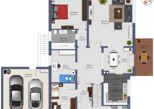 Es ist ein tolles ZFH mit 2 in sich geschlossenen Wohnungen mit sog. Abgeschlossenheitserklärung: EG / 5 Zimmer / Küche / Bad (Tageslicht m. Badewanne) / 135,71 m² und OG = DG / 3 Zimmer / Küche / Bad / Tageslicht m. Badewanne) / 102,90 m² = insgesamt 10 Zimmer / ca. 313 m² Wohnfläche (WFL). Die Wohnungen sind über ein großzügiges Treppenhaus miteinander verbunden. Zudem gibt es dort noch ein Gäste-WC (Tageslicht).