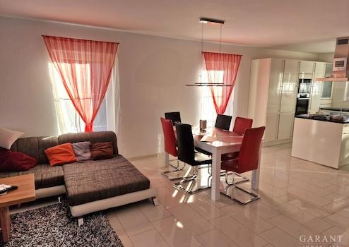 lichtdurchflutete Wohn-/Essbereich und die offene Küche.