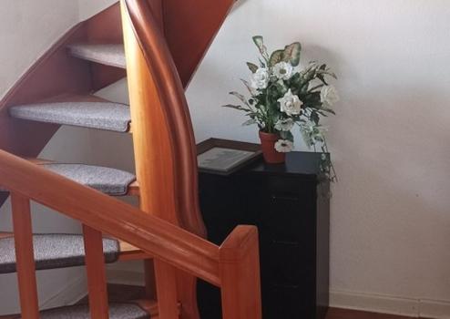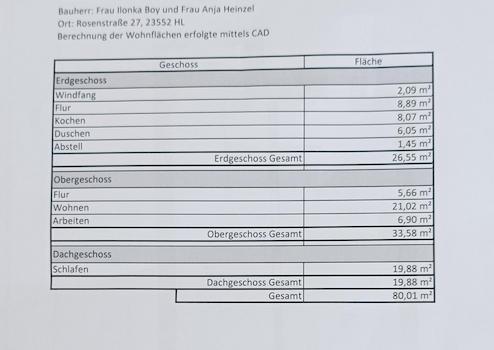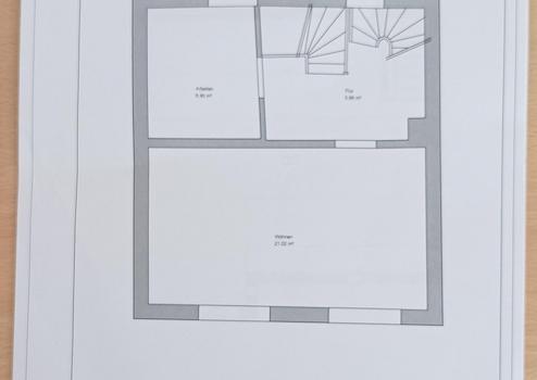 Im Erdgeschoss befinden sich ein Windfang, eine Küche und das ebenerdige Duschbad mit Fenster. In der ersten Etage befinden sich das Wohnzimmer mit Blick zur Straße sowie das Kinderzimmer (oder Büro) mit Fenster zum Hof. Die 2. Etage ist das zum Schlafzimmer ausgebaute Dachgeschoss. Im Erdgeschoss befindet sich durchgängig ein Fliesenboden, in der 1. und 2. Etage Holzdielenboden.