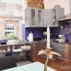 Große Wohnküche, hochwertig ausgestattet mit Geschirrspüler, Mikrowelle, Espressomaschine, Esstisch mit 6 Stühlen, Original Wandfliesen aus dem Jahr 1868.