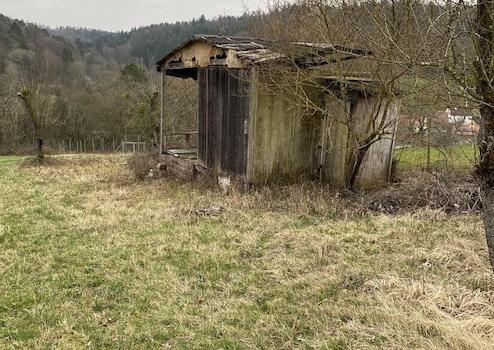 Das Freizeitgrundstück mit ca. 1077 qm hat eine renovierungsbedürftige Geschirrhütte mit Aussichtsterrasse.