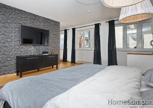 Bequem gelangen Sie mit dem Aufzug in die 2. Etage, Sie bewohnen die gesamte Etage mit ca. 160 m² Wohnfläche allein. Bei Eintritt in die Wohnung gelangen Sie direkt in den Essbereich mit offener Küche. Die hochwertige Einbauküche bietet Spülmaschine, Kochzone, Backofen, Mikrowelle und Kaffeevollautomat. Die Wohnung verfügt über eine geschmackvolle, moderne Möblierung mit einem Philips CLEAN AIR-Filtersystem, einer Klimaanlage im Hauptschlafzimmer sowie Bewegungsmelder mit Fernalarm auf dem Smartphone. In beiden Schlafzimmern genießen Sie höchsten Schlafkomfort in den bequemen Boxspringbetten. Es sind drei 4 K-Fernseher im Wohnzimmer und in den Schlafzimmern installiert, eine Klimaanlage sorgt für eine behagliche Raumatmosphäre, ein großer begehbarer Kleiderschrank im Hauptschlafzimmer bietet viel Raum für Ihre persönlichen Dinge. Das hochwertige Bad-en-suite ist mit Wanne und separater Dusche ausgestattet. Ein Gäste-WC bietet Ihnen zusätzlichen Komfort. Die Wohnung verfügt über alle wichtigen Annehmlichkeiten für ein komfortables Wohnen, darunter Waschmaschine und Trockner in einer separaten Kammer, eine voll ausgestattete Küche, einen gemütlichen Arbeitsbereich mit Aktenschränken und Drucker, einen offenen Kamin und einen Keller für zusätzlichen Stauraum. In allen Räumen haben Sie beste Verbindung zum Highspeed WLAN. Vom Essbereich gelangen Sie auf den rückwärtigen Balkon.