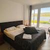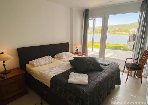 Das gemütliche Schlafzimmer bietet ausreichend Platz für ein komfortables Doppelbett. Genießen Sie beim Aufwachen den direkten Blick auf den Rhein - eine Aussicht, die pure Entspannung verspricht.