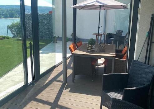 Die weitläufige Terrasse bietet Ihnen eine atemberaubende Aussicht auf den Rhein. Perfekt geeignet für entspannte Stunden in der Sonne oder lauschige Abende unter freiem Himmel.