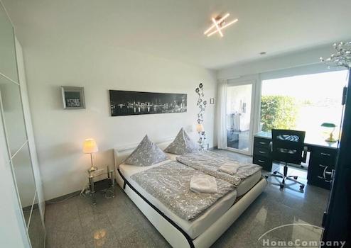 Das gemütliche Schlafzimmer bietet ausreichend Platz für ein komfortables Doppelbett. Genießen Sie beim Aufwachen den direkten Blick auf den Rhein - eine Aussicht, die pure Entspannung verspricht.