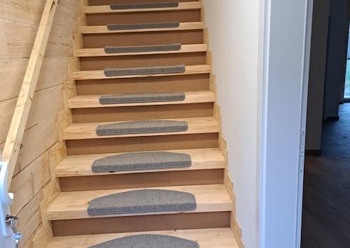 Die Trennwände sind verspachtelt, geschliffen und fachgerecht in weiß gestrichen. Die tragenden Wände sind aus Massiv KVH-Holz montiert sind geschliffen und dürfen nicht weiterbearbeitet werden.