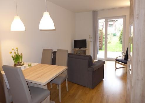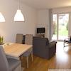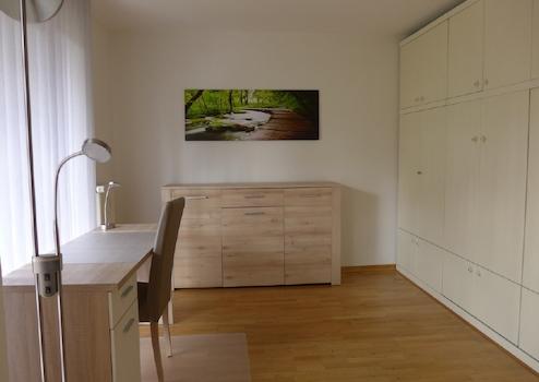 Der Raum öffnet sich zur breiten Fensterfront mit großzügiger Terrasse, die ein entspanntes Verweilen mit Blick in gepflegte Gärten ermöglicht. Die moderne Möblierung erfüllt mit Esstisch, Sofa Schreibtisch und 2 Betten , die tagsüber in die Schrankwand eingeklappt werden können, alle Bedürfnisse.