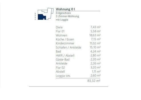 Die hier angebotene Wohneinheit verteilt sich auf 3 Räume, Bad, Gäste-WC, Abstellkammer, Hauswirtschaftsraum und Ankleidebereich sowie einer Loggia, von welcher aus der Wohnbereich und die Küche zu erreichen sind. Im Kellergeschoß befindet sich ein weiterer, der Wohnung zugehöriger Abstellraum.
