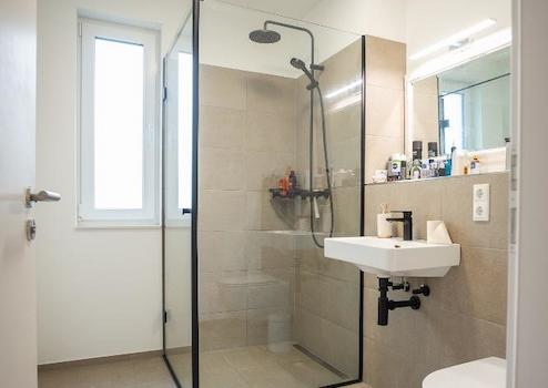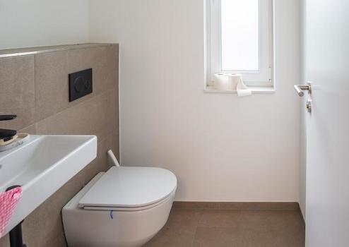 Im Erdgeschoss befindet sich der großzügige Wohn-Ess-Bereich mit integrierter Küche und raumhohen Fenstern mit Zugang zur Terrasse. Über die gesamte Länge des Wohnzimmers finden sich Fenster, die überdurchschnittliche Helligkeit im Erdgeschoß bieten. Ebenso befindet sich hier ein Gäste-WC und der Hauswirtschaftsraum, der mit dem Haustechnikraum kombiniert ist. Es wurde modernste Technik (Wärmepumpe, Lüftungsanlage mit Energierückgewinnung, Verwendung erneuerbarer Energie) verbaut. Aus dem HWR erreichen Sie auch den hinteren Gartenbereich.