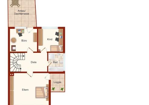Die nach Westen ausgerichtete Dachterrasse lädt zu gemütlichen Abenden im Freien ein, während die östlich ausgerichteten Loggien im Ober- und Dachgeschoss perfekt sind, um die Morgensonne zu genießen. Ein vollständig unterkellertes Haus bietet zusätzlichen Stauraum für Ihre Bedürfnisse.