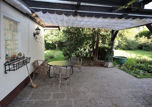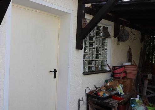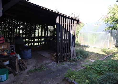 große Garage für 1-2 Fahrzeuge mit angebautem Geräteraum, Terrasse (Überdachung renovierungsbedürftig), große Holzlege, Gemüsegarten mit Gewächshaus, Gartenteich