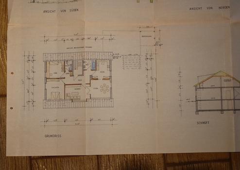 Küche, Wohn/Essbereich mit Kachelofen, Windfang, große Diele/Treppenhaus, Gäste-WC, Abstellraum, Schlafzimmer, 2 Kinderzimmer, Bad mit WC, Dusche und Badewanne