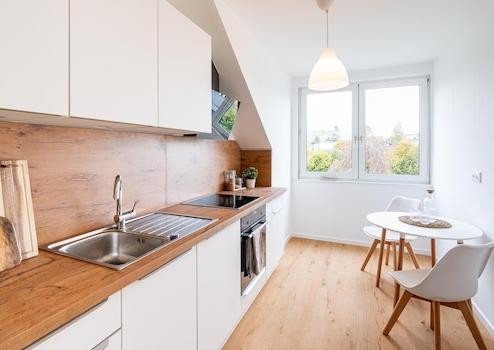 Die neue Einbauküche ist ein echtes Highlight und bietet ausreichend Platz für einen Tisch und Stühle.