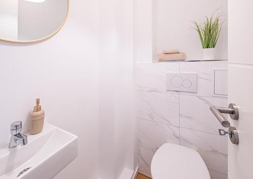 Das stilvolle Badezimmer ist mit einer komfortablen Badewanne ausgestattet, zusätzlich steht Ihnen ein saniertes Gäste-WC zur Verfügung.