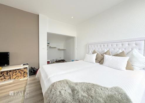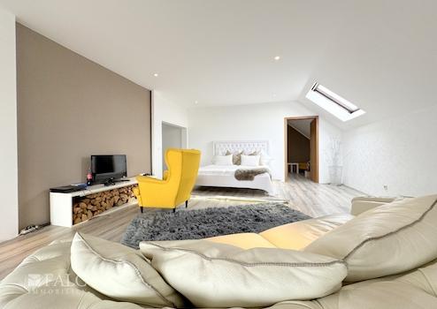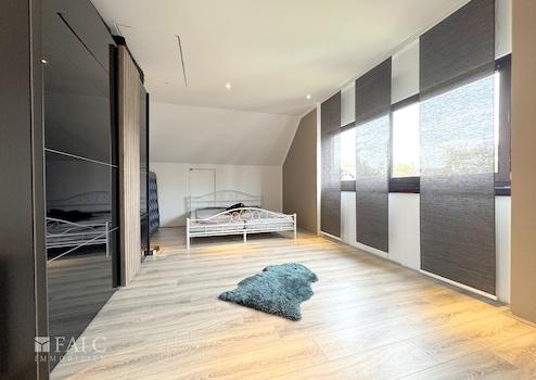 Im Obergeschoss befindet sich ein weiteres großzügiges Schlafzimmer, das um einen angrenzenden Raum für vielfältige Nutzungsmöglichkeiten ergänzt wird. Ein Balkon mit Blick auf den Garten lädt zum Entspannen ein.