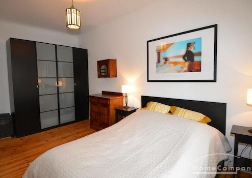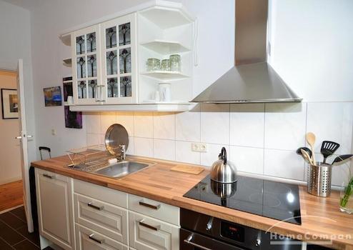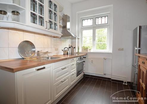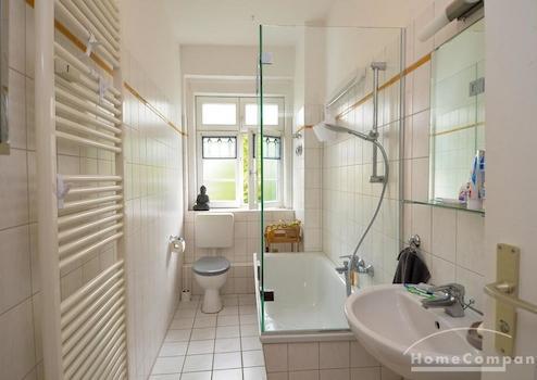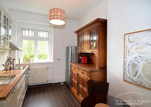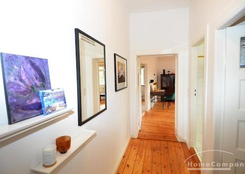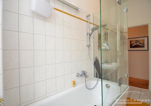 Geschmackvoll eingerichtete Altbauwohnung in denkmalsgeschützter Wohnanlage in Weißensee. Die Wohnung verfügt über ein gemütliches, helles Wohnzimmer mit Schreibtisch, kleinem Fernseher (24 Zoll) und ein einladendes Schlafzimmer (Durchgangszimmer) neben dem Wohnzimmer. Das Schlafzimmer bietet neben dem großen Kleiderschrank auch ein Doppelbett. Die Küche im Landhausstil ist ausgestattet mit einer Spülmaschine, einem Kühlschrank mit Gefrierschrank und einer Waschmaschine. Modern gefliestes Tageslichtbad mit Badewanne und Glastrennwand.