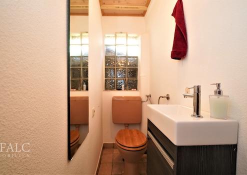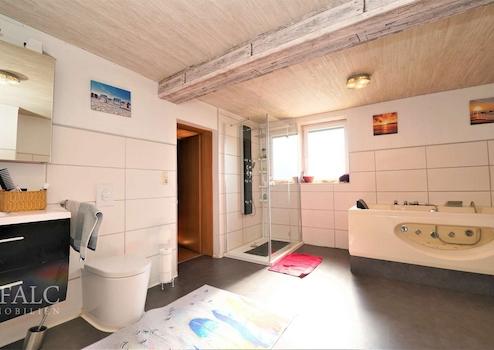 Ein eigenes Tageslicht-Bad steht ebenfalls zur Verfügung. Eine Wanne mit Whirlpool-Düsen lädt zu entspannenden Schaumbädern ein, eine ebenerdige Duschkabine erwartet Sie mit Massagedüsen und Regenduschkopf. Ein separates WC auf der Etage verhindert lästige Störungen beim Entspannen.
