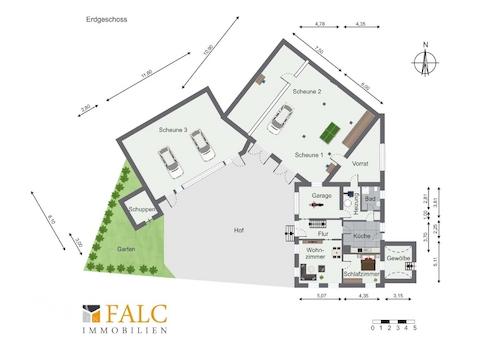 In den zum Haus gehörigen 3 Scheunen und der Garage findet sowohl der Fuhrpark als auch Ihr Hobby ausreichend Platz. Eine Höhe von etwa 5 Metern ermöglicht sogar den Einbau einer Hebebühne oder der Errichtung eines Heubodens.
