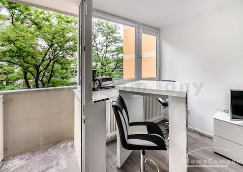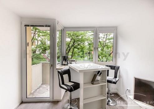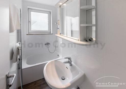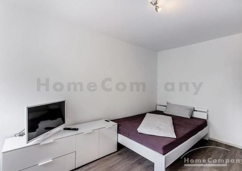 Modern möbliertes Appartment (Typ Capucchino XL) im Stadtteil Westend; renoviert, Parkettboden, Wohn-/Schlafraum mit Queen-Size-Bett (140 x 200 cm) mit Volllatex-Naturkautschukmatratze (17 cm). Kleiderschrank, Essplatz und Kabel-TV. Separate Küche mit Backofen, Mikrowelle und Spülmaschine. Bad mit Badewanne. Gebührenpflichtige Münz-Waschmaschine in der Waschküche des Hauses vorhanden.