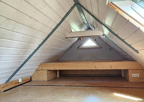 Im Dachgeschoss sind nochmal zwei Zimmer mit WC und Waschbecken. Von hier aus führt eine Wendeltreppe in den ausgebauten Dachspitz/Dachstudio.